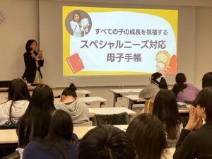 本学2年生対象の授業「子ども家庭支援の心理学」で、東京都議会議員 龍円あいり先生による特別公演が行われました。
